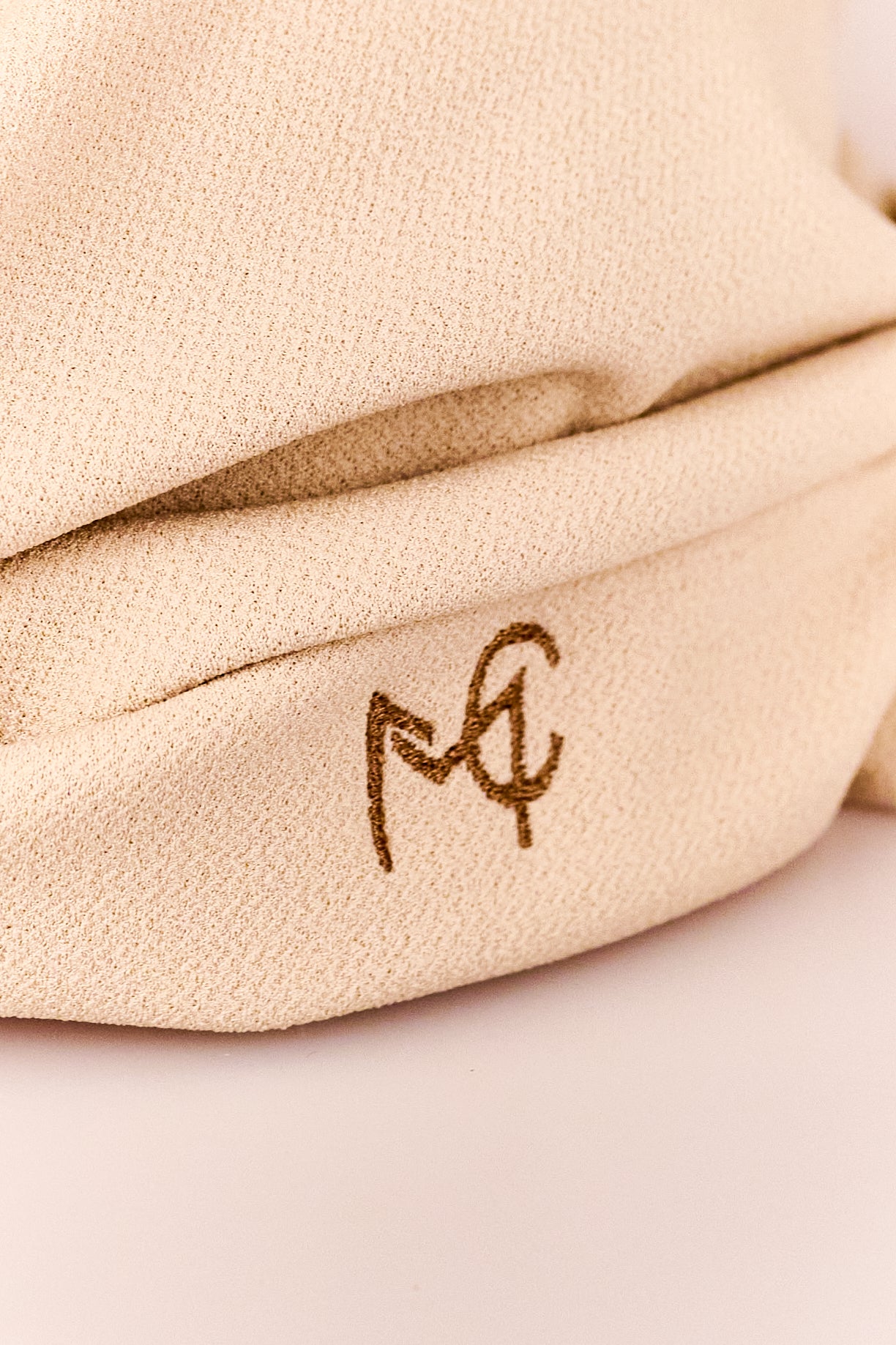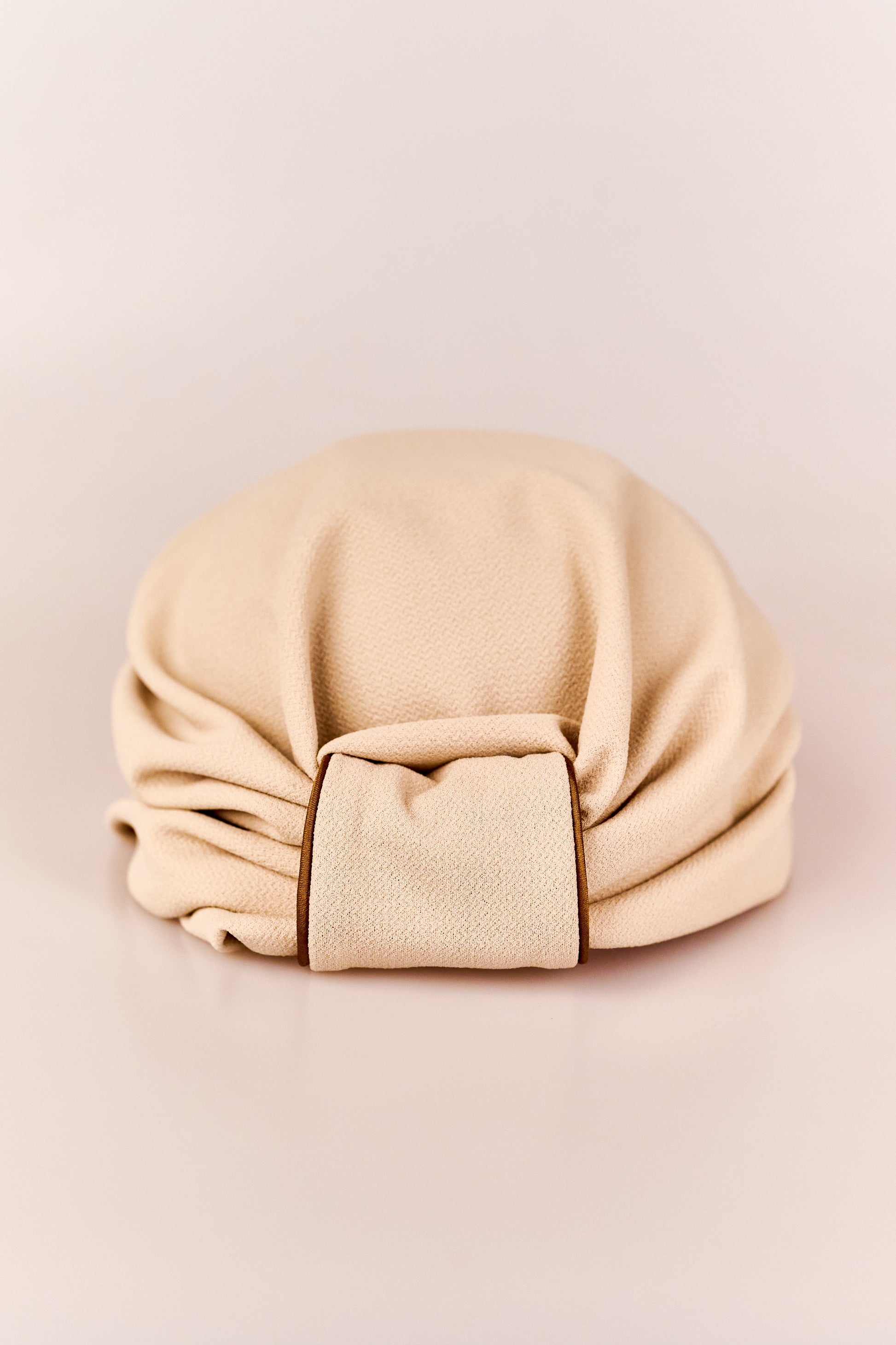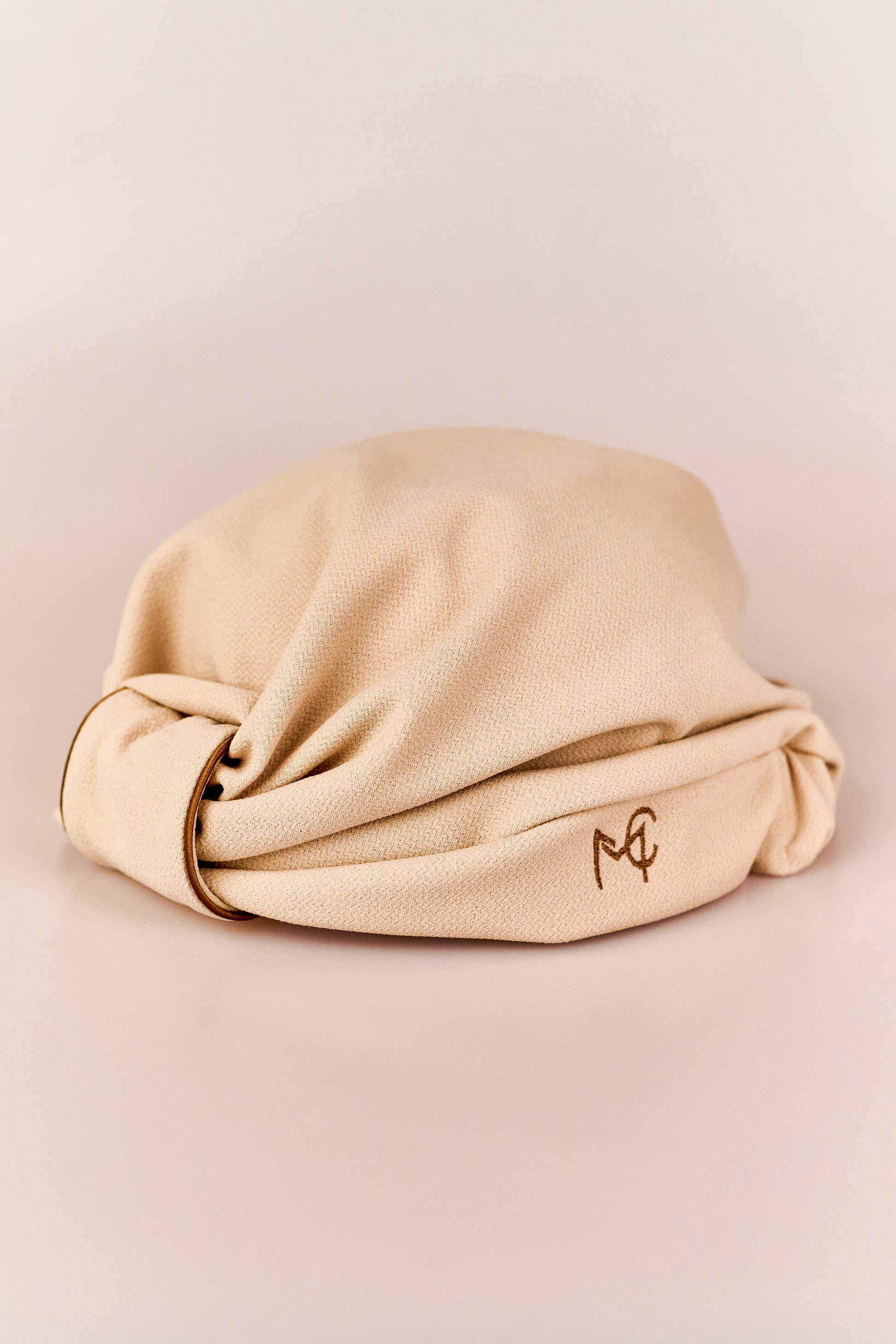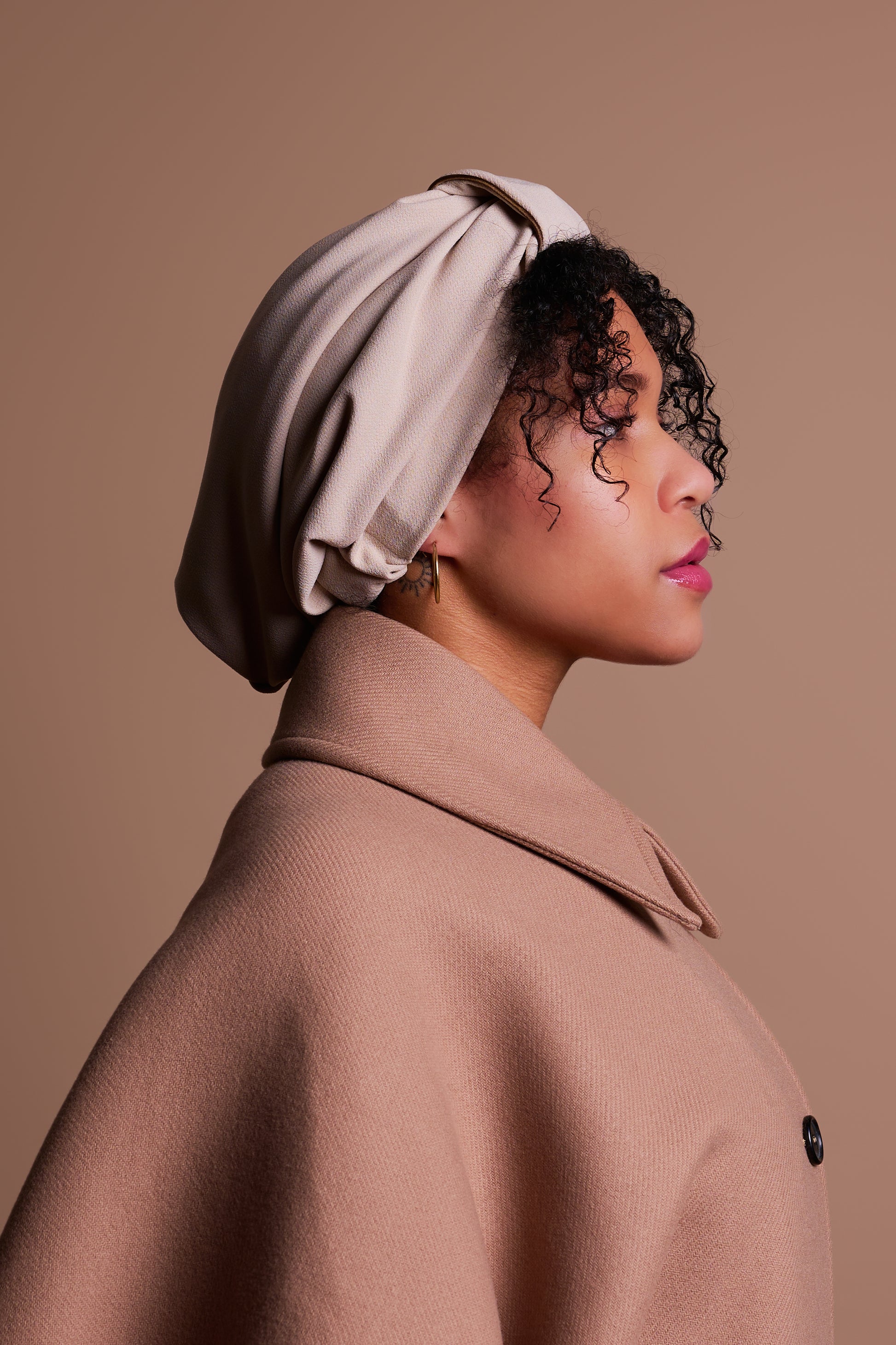 Deze turban straalt een warme en rustgevende uitstraling uit, met zijn zachte gelig-beige kleur die doet denken aan zonovergoten zandduinen. Gemaakt van luxueus materiaal, biedt deze turban niet alleen stijl, maar ook comfort en veelzijdigheid.